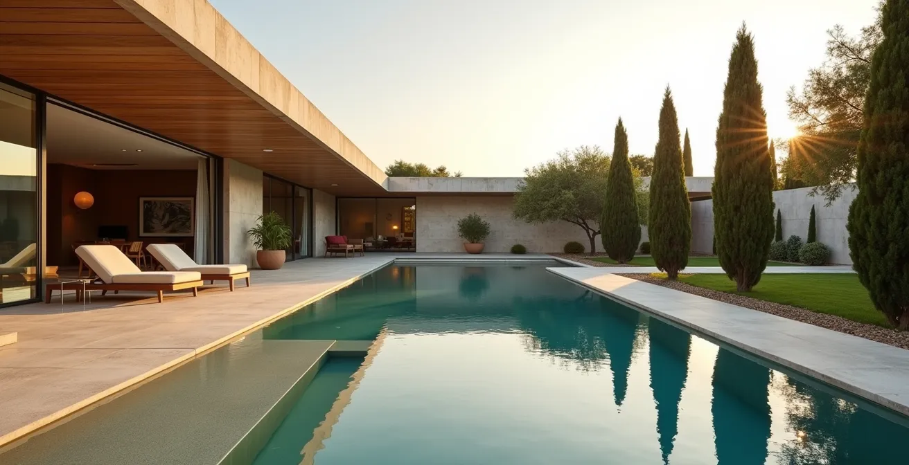 L’integrazione di uno specchio d’acqua a filo pavimento è una delle strategie più potenti dell’architettura minimalista per manipolare la percezione dello spazio. Il principio non è decorativo, ma ottico e psicologico. Eliminando ogni bordo rialzato, si crea una continuità materica tra la pavimentazione interna e la superficie liquida esterna. L’occhio non percepisce più un confine netto, ma una transizione fluida che estende visivamente i limiti dell’ambiente abitativo verso l’esterno. Questo effetto è massimizzato quando la superficie dell’acqua, perfettamente immobile, agisce come uno specchio, riflettendo il cielo e la luce. Il risultato è una sensazione di maggiore ampiezza, luminosità e apertura.